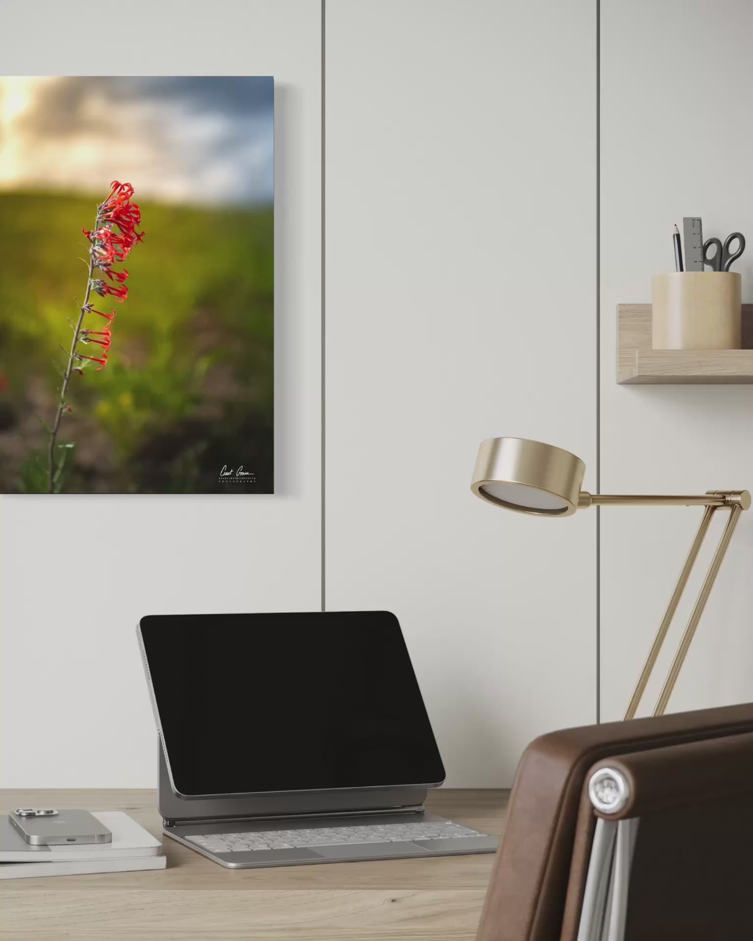 This is a frameless mid-gloss metal print (dye-sublimated on aluminum) with 1/8" round corners and a float-mount hanger on the back. That float mount stands the print slightly off the wall and creates a clean shadow gap for a finished, gallery-style look.